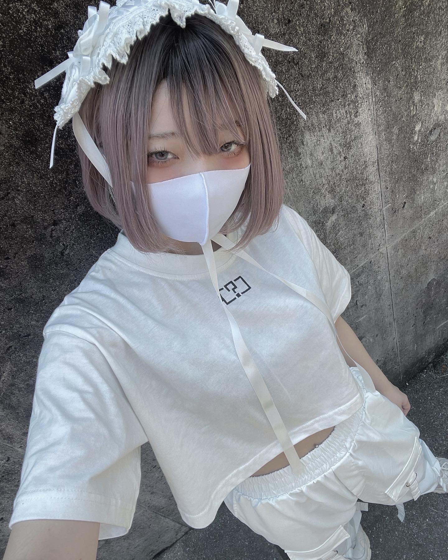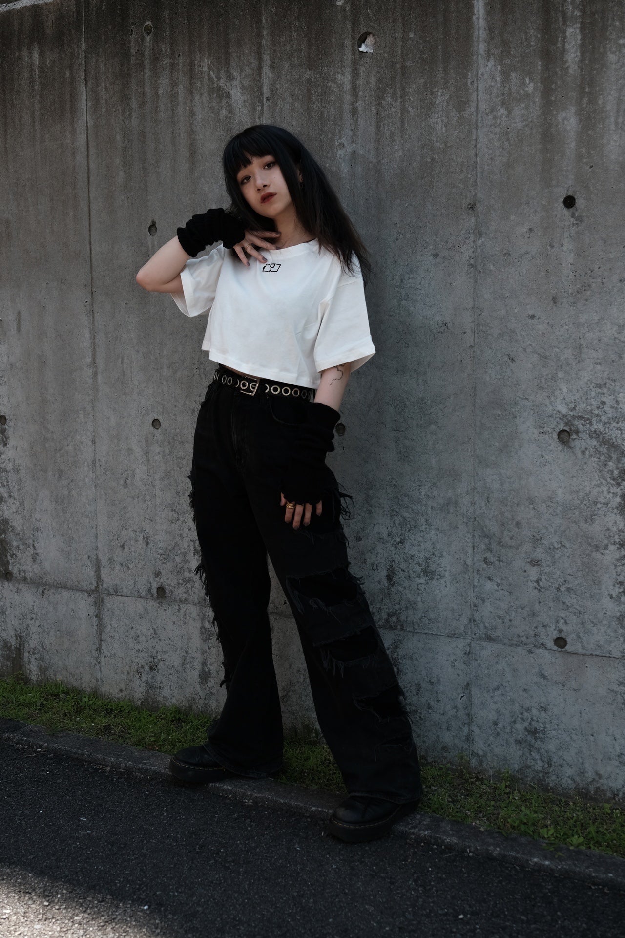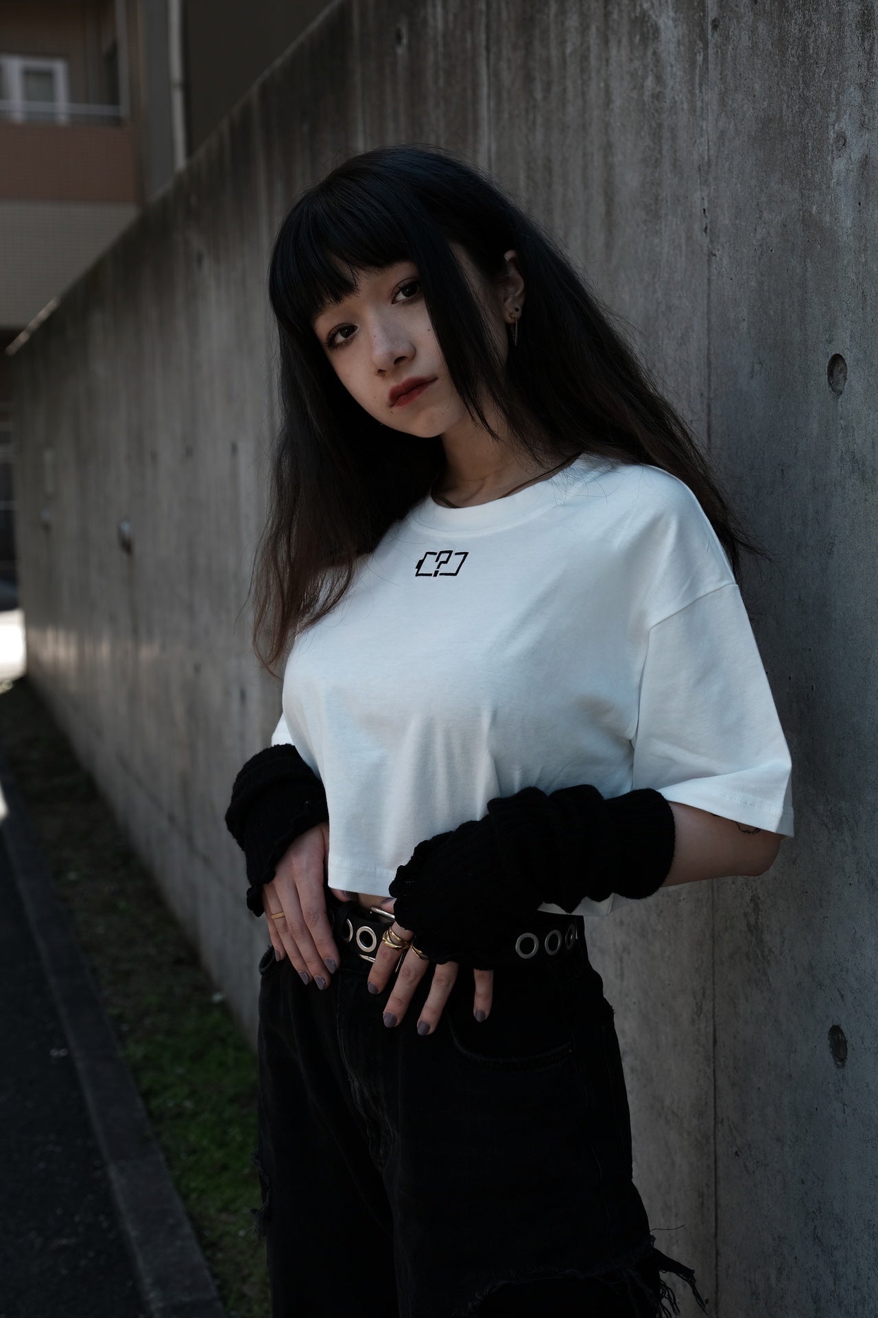 胸元にバッテリーの刺繍を施した丈の短めのTシャツ。
