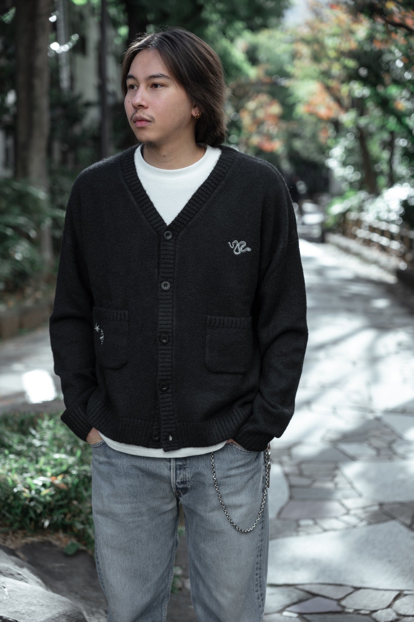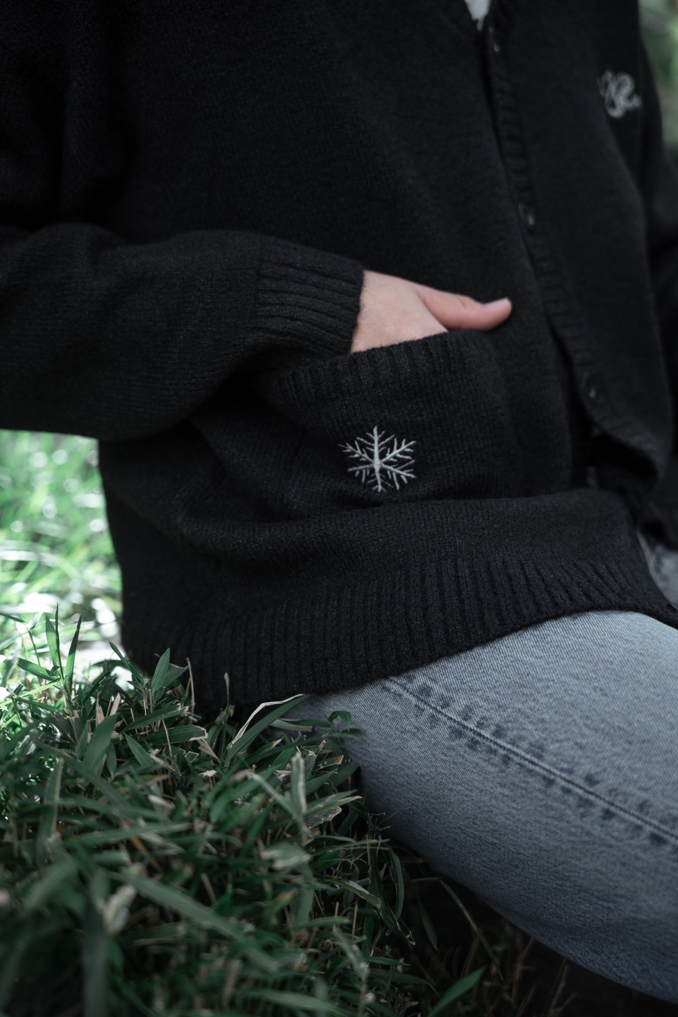 程よいシャギー素材に雪結晶刺繍が可愛いカーディガンとなっております。